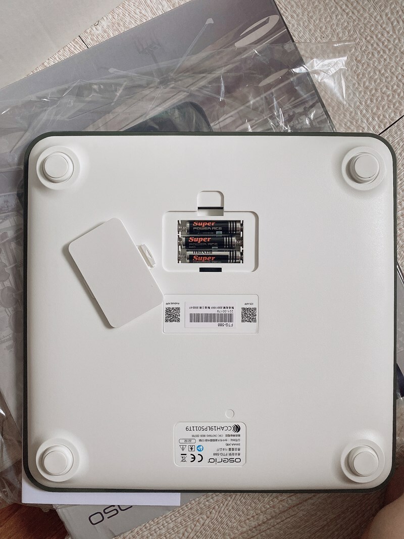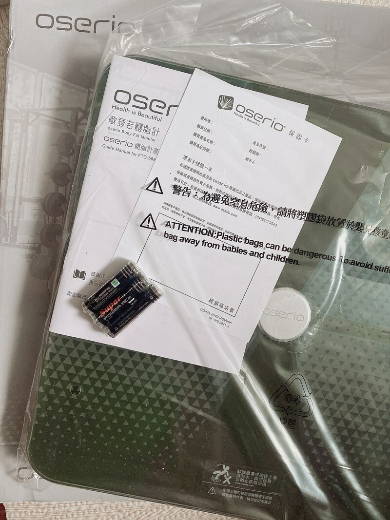Oserio 歐瑟若品牌簡約形象,說明書簡單明瞭,也可以掃QR CODE閱讀說明書,以前購買的體重計很少提供電池,Oserio 歐瑟若 居然有提供耶!(超貼心)