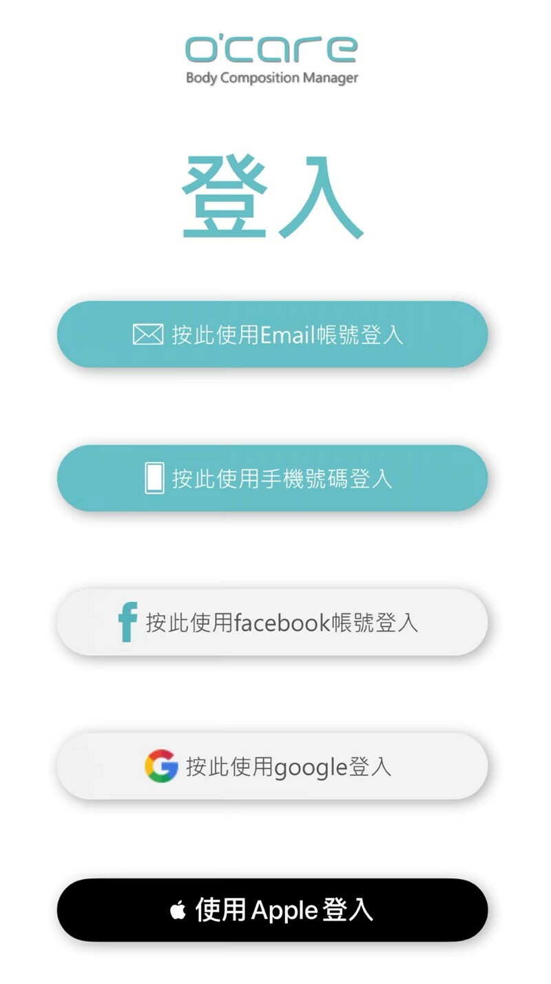 首先先在手機下載「o'care」app → 點開app後會有登入畫面