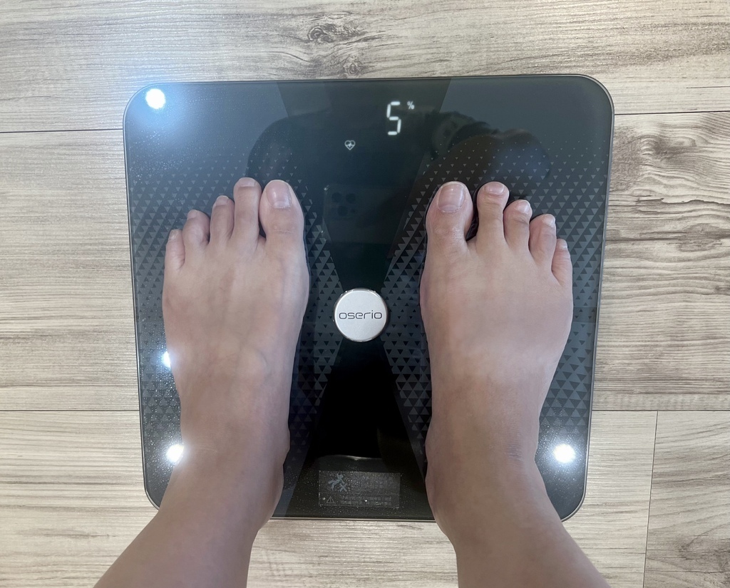 歐瑟若心率體脂計踩上去就可以量測,不像傳統體脂計還要對準測量區塊