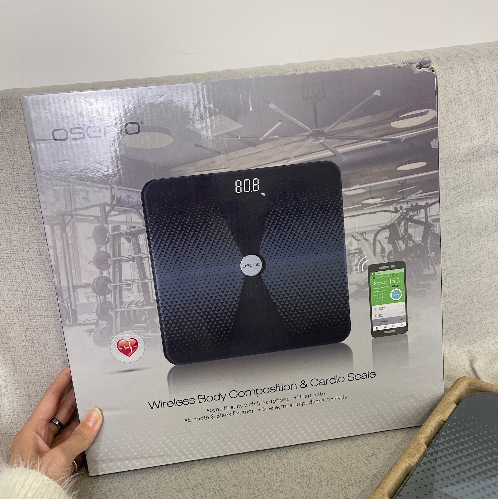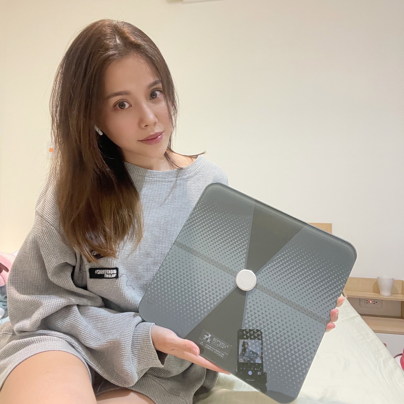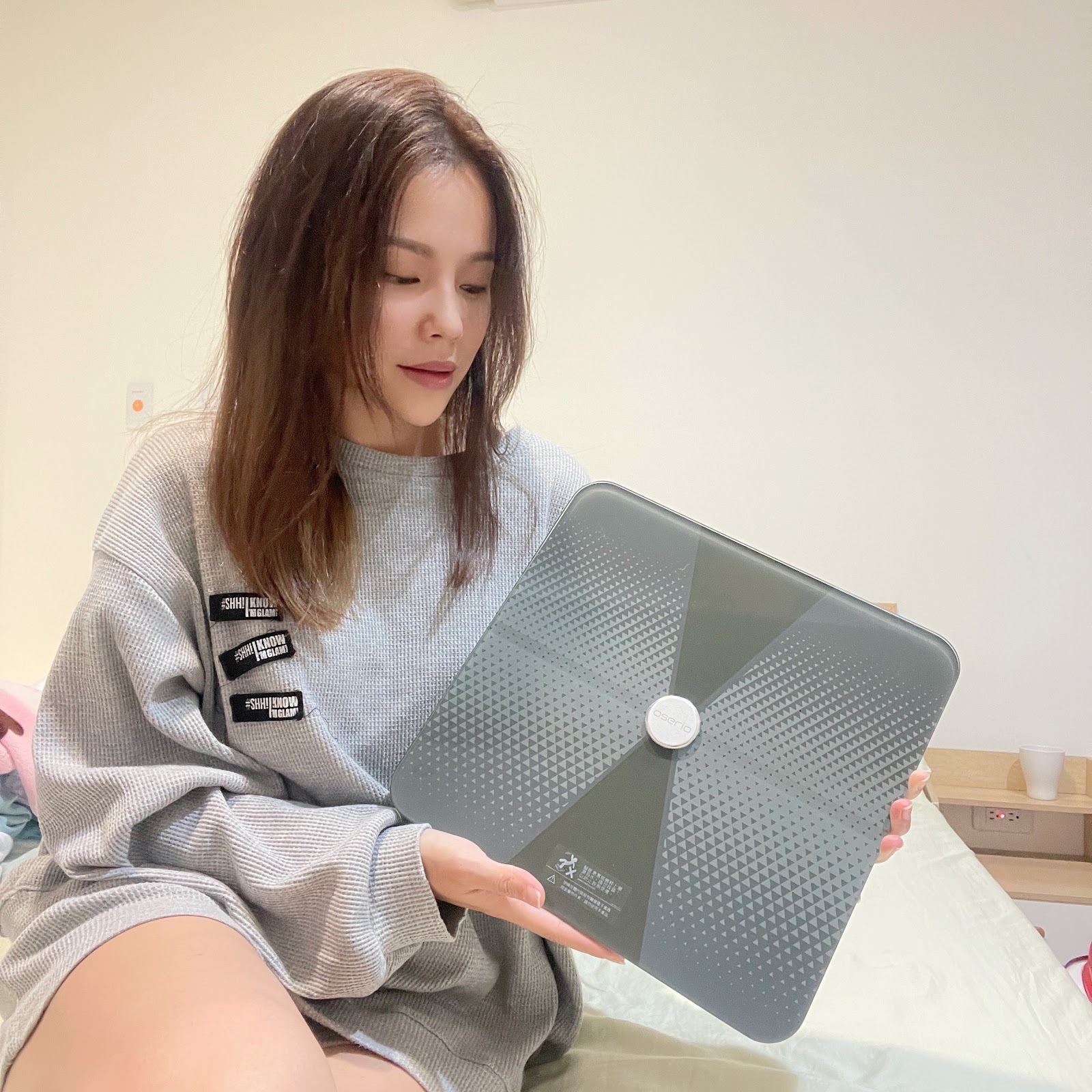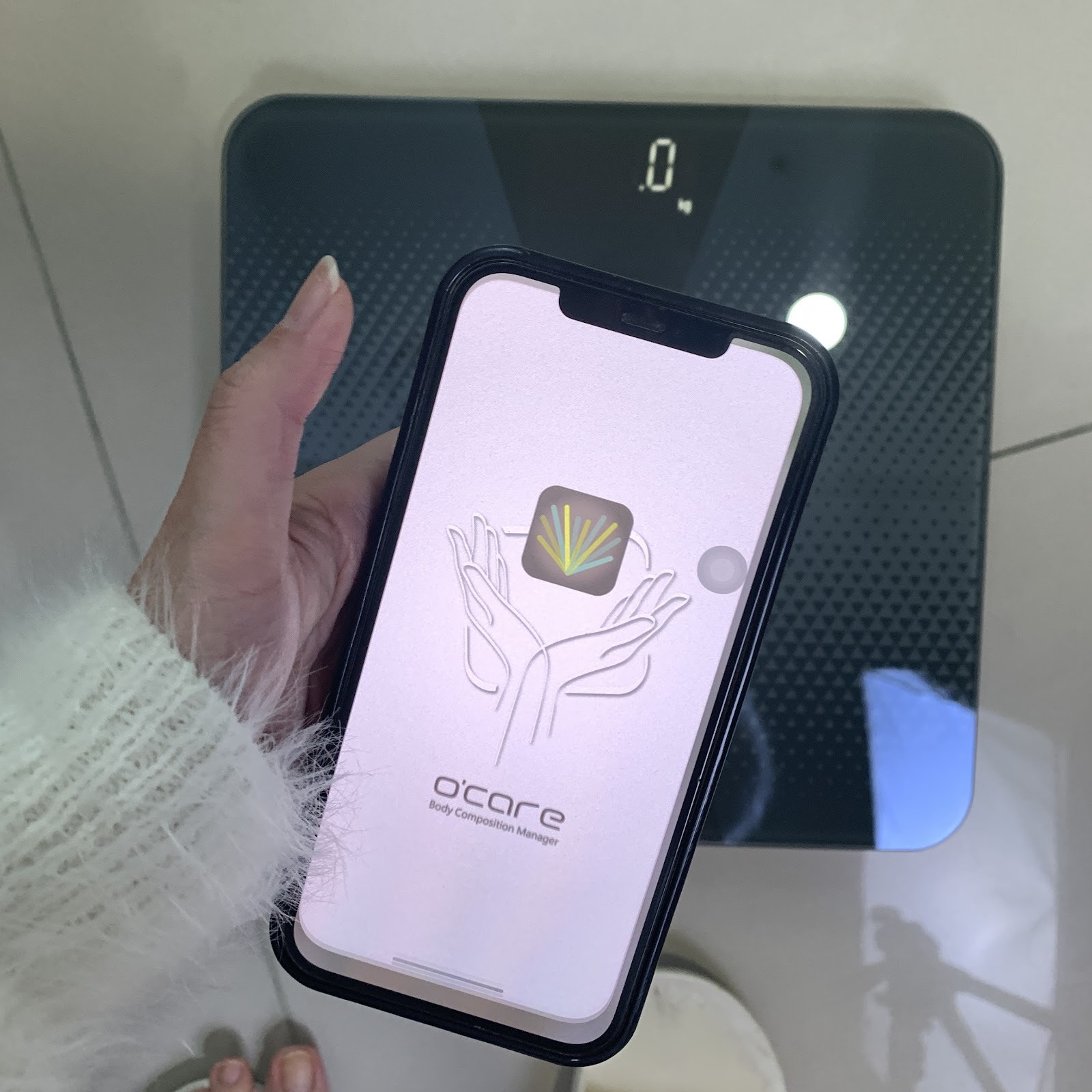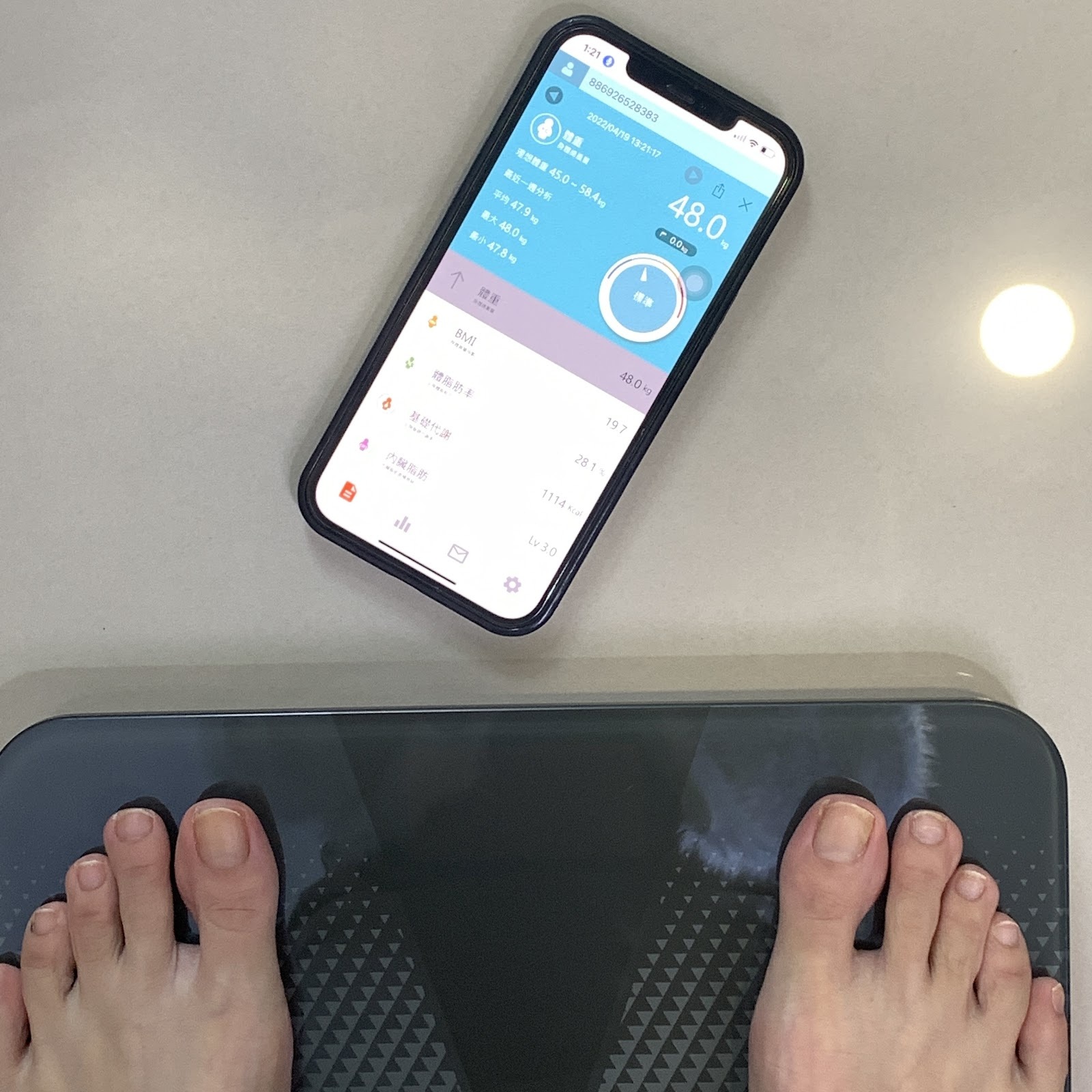 我都會先打開手機上的歐瑟若體脂計APP,放旁邊的桌上然後再站上去測量~