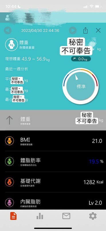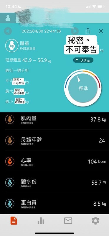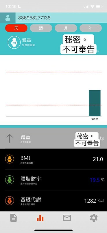 基本的體重之外~ 體脂肪率/BMI/內臟脂肪/基礎代謝率/體水率/心率/心律等等~~
