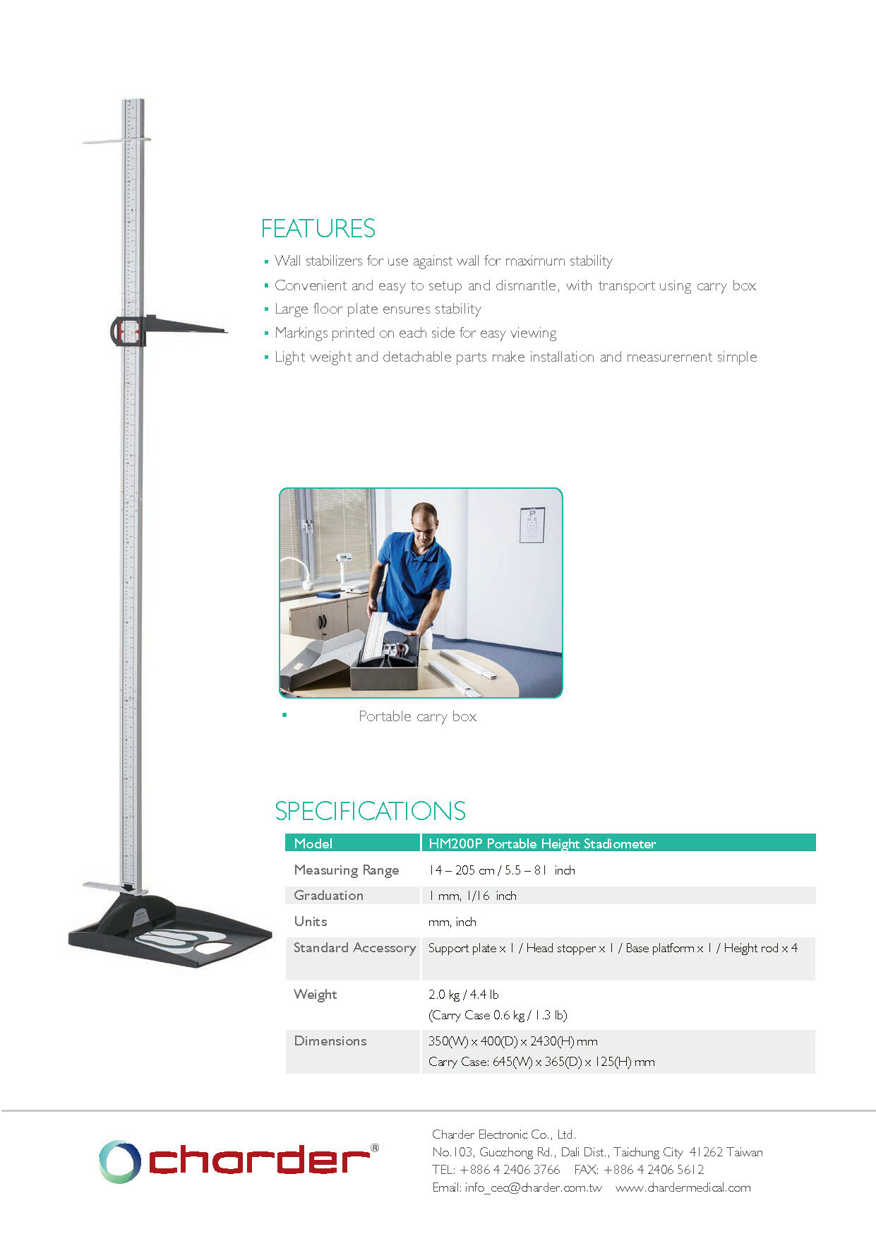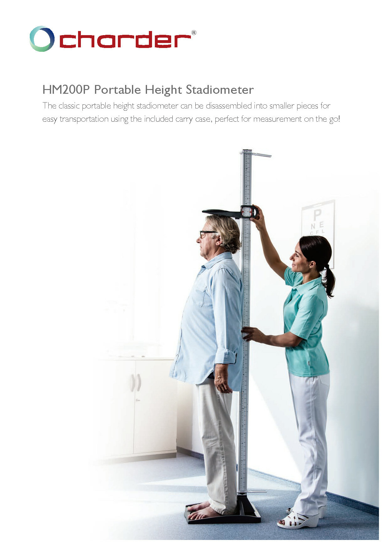The HM200P mechanical stadiometer disassembles into small pieces for easy transportation using the included carry case. It can be set up nearly anywhere for measurement at home, in offices, or in clinics.