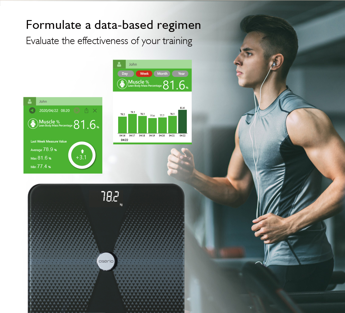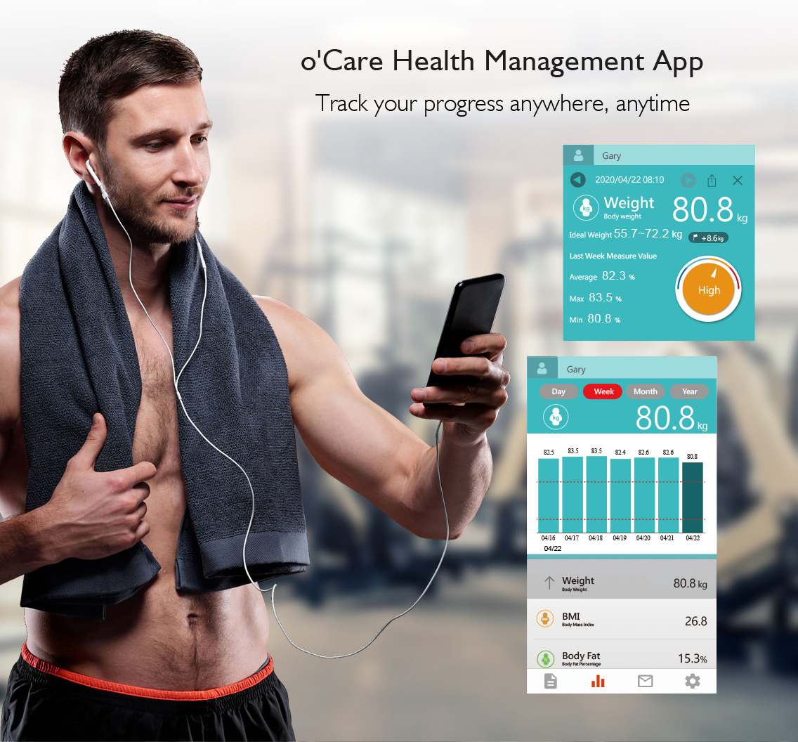 Analyze body composition and heart rate quickly and conveniently, and evaluate training effectiveness! Results are automatically synced with your smartphone via the free O'Care App, available for both iOS & Android devices. Track results easily without pen and paper!