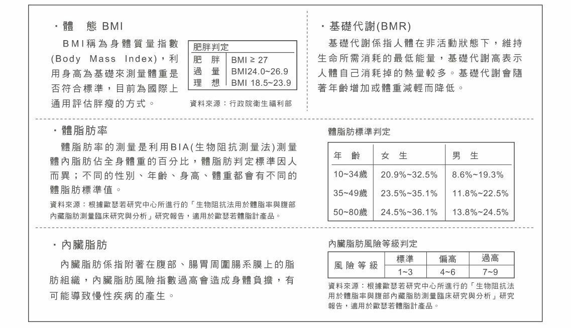 | 備註 | 體內裝設有醫療電子儀器(如:心律調整器 ...等), 請勿使用本產品,否則可能會影響植入式醫療器材。 孕婦及體內裝設有金屬物件者, 不建議使用本產品,否則可能會影響量測準確度。 請勿讓幼童接觸本產品。 |